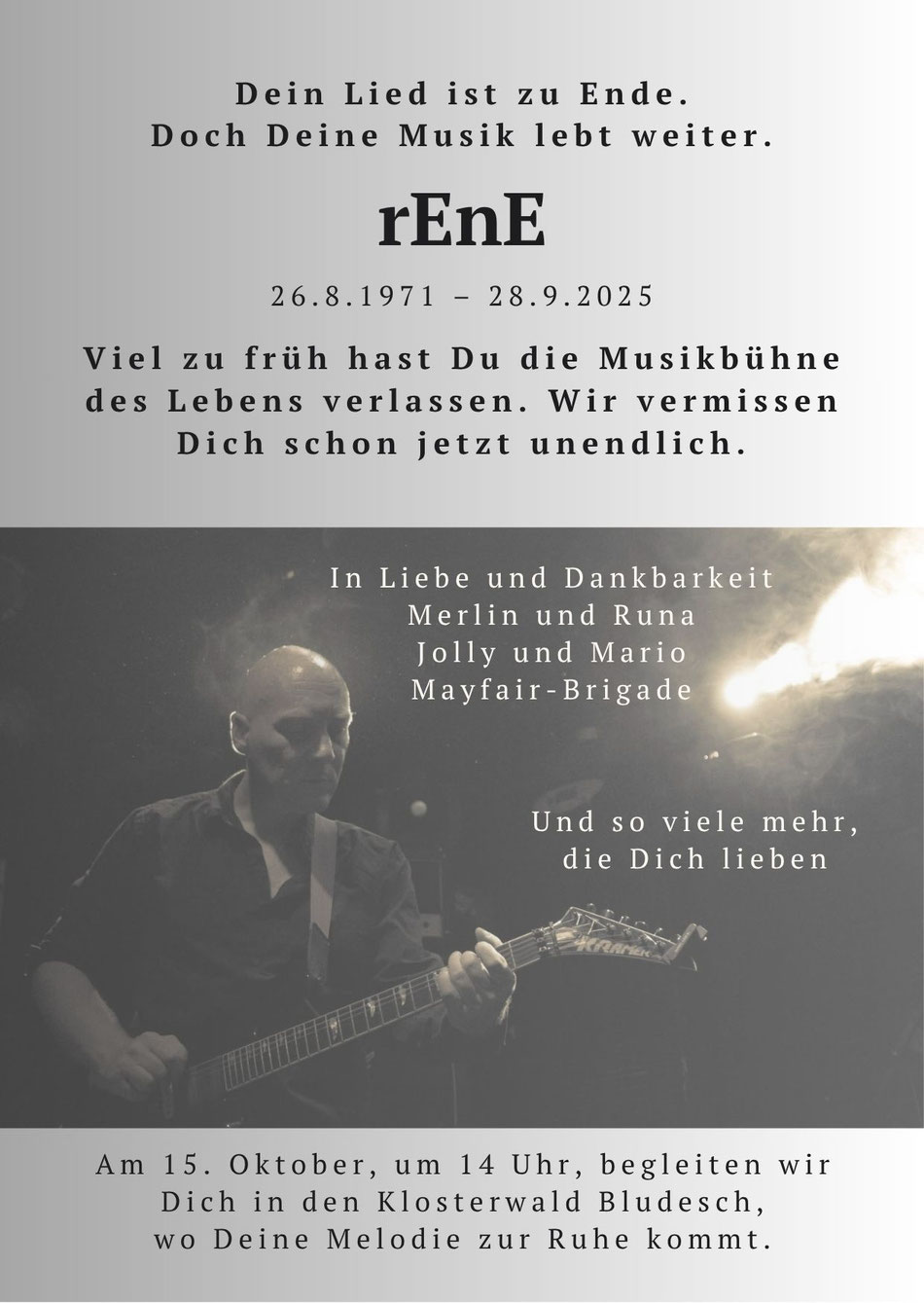 It is with heavy hearts that we announce the passing of our dear friend and founding member, Rene "Mötle" Konzett. For us HE was "Rock and Roll" and made our songs with his style and every note so special.